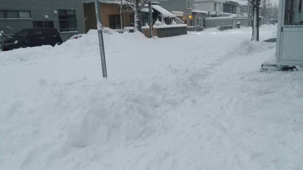 道路は一面真っ白、道のところどころには雪の山。